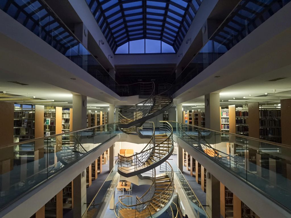 Biblioteka umiejscowiona jest po drugiej stronie ulicy. Można się tam dostać za pomocą łącznika, bez konieczności wychodzenia z budynku. Ma ona charakter otwarty z wolnym dostępem do półek bez tradycyjnego podziału na czytelnię i wypożyczalnię. Uczniowie mogą tu w spokoju odrobić lekcje, pouczyć się lub odpocząć na licznych pufach i fotelach.