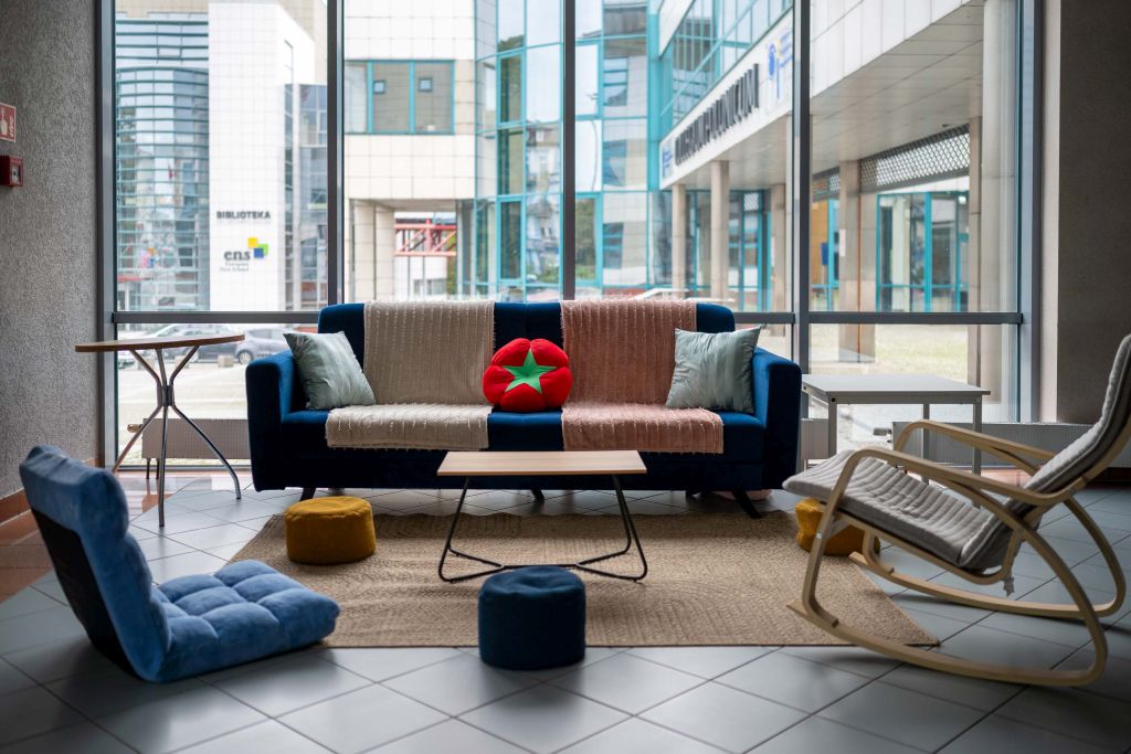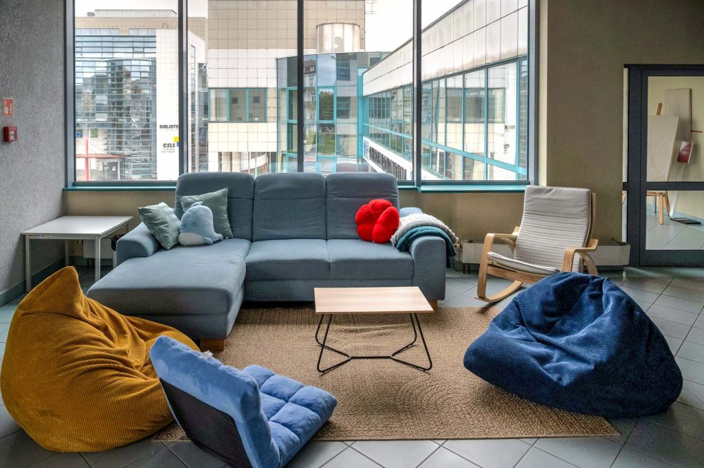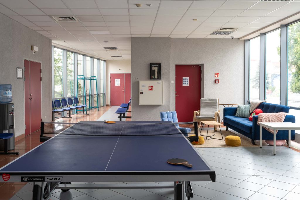 Na każdym piętrze znajdują się kanapy, fotele, pufy, aby uczniowie mogli znaleźć chwilę wytchnienia między lekcjami. Można też spróbować sił w grze w ping-ponga lub piłkarzyki.